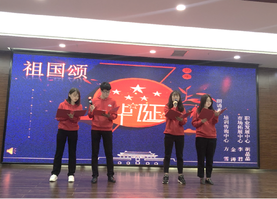為迎接建國70周年,2019年9月27日,中智華中、湖北公司在武漢人力資源服務(wù)產(chǎn)業(yè)園隆重舉辦主題為“我愛我的祖國”朗誦會。中智華中、湖北公司全體員工參加本次朗誦會。