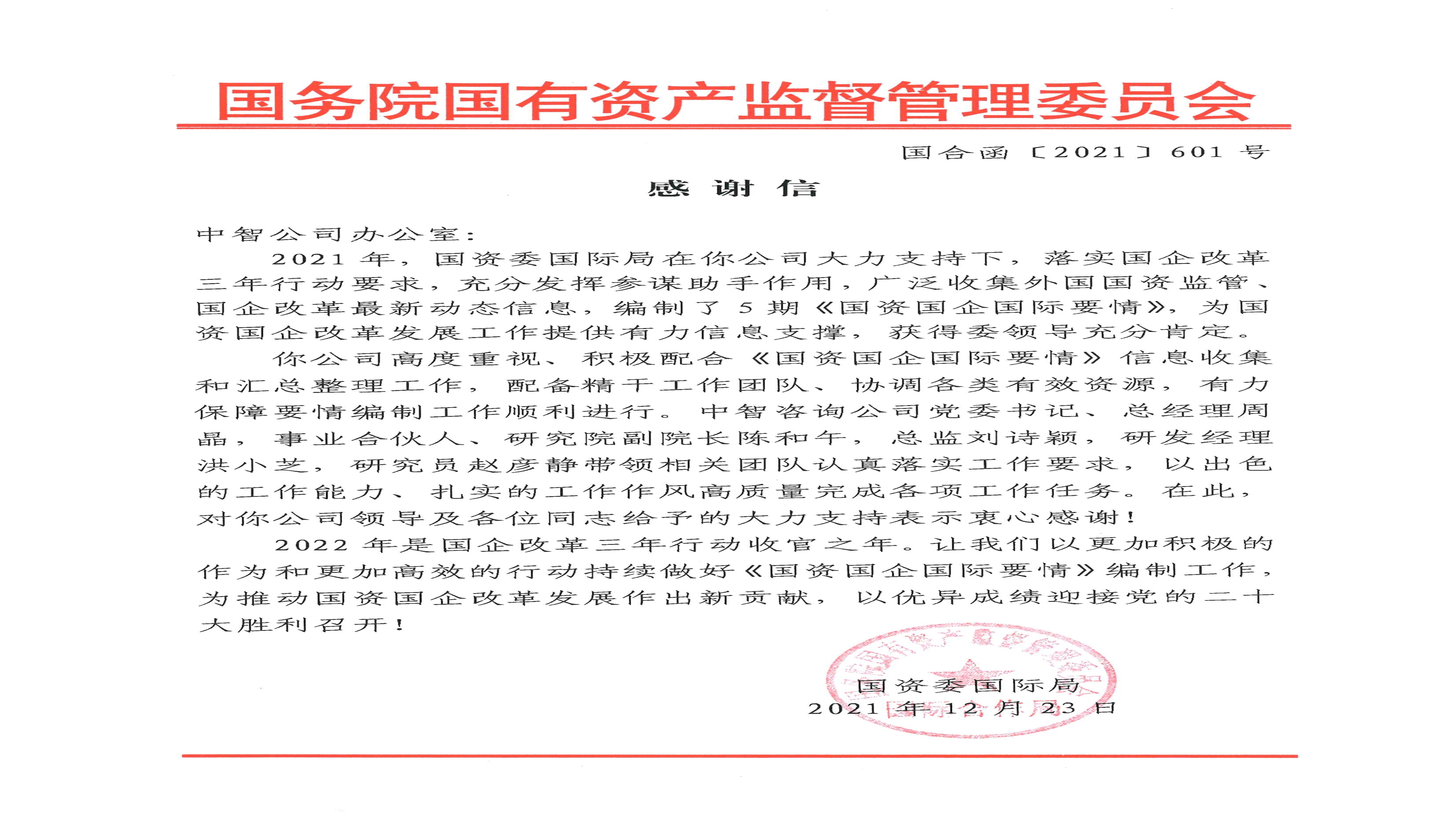 《國資國企國際要情》獲得國務院國資委國際合作局感謝信