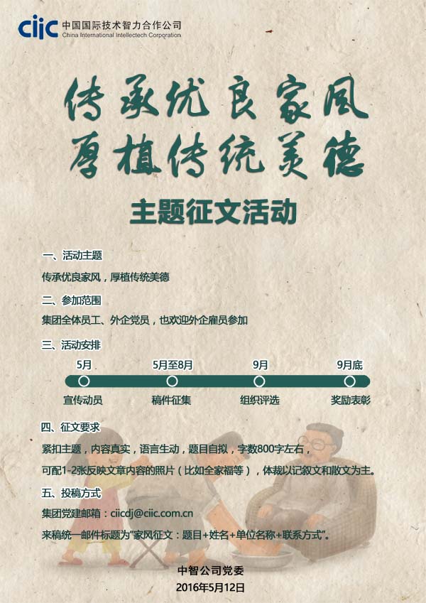 集團黨建郵箱:ciicdj@ciic.com.cn;來稿統一郵件標題為“家風征文:題目+姓名+單位名稱+聯系方式”。