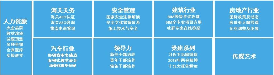 ??? 中智大學堂發揮資源優勢與多年的行業經驗,在黨建、領導力、人力資源、海關關務、安全管理、傳媒藝術、建筑行業、房地產行業、汽車行業等領域開發出了系列爆款產品,打造全場景覆蓋,混合型學習和管理,行業級培訓解決方案。